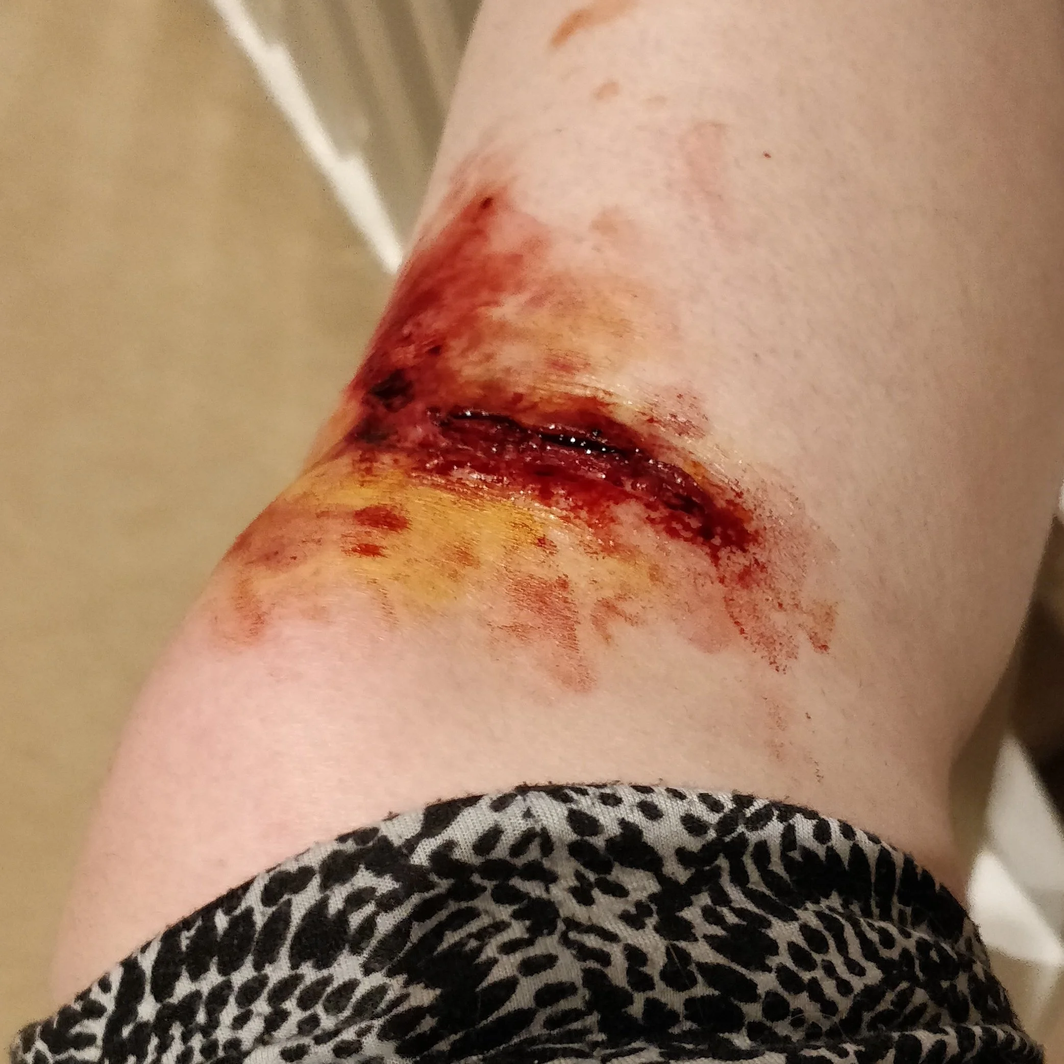 I would also like to alter the positioning of the wound as I feel I applied it higher than I was aiming for. I would like to apply it more below the kneecap next time. This might be easier if I was applying the makeup on someone else as the angle required to apply makeup below your own knee can be quite uncomfortable!